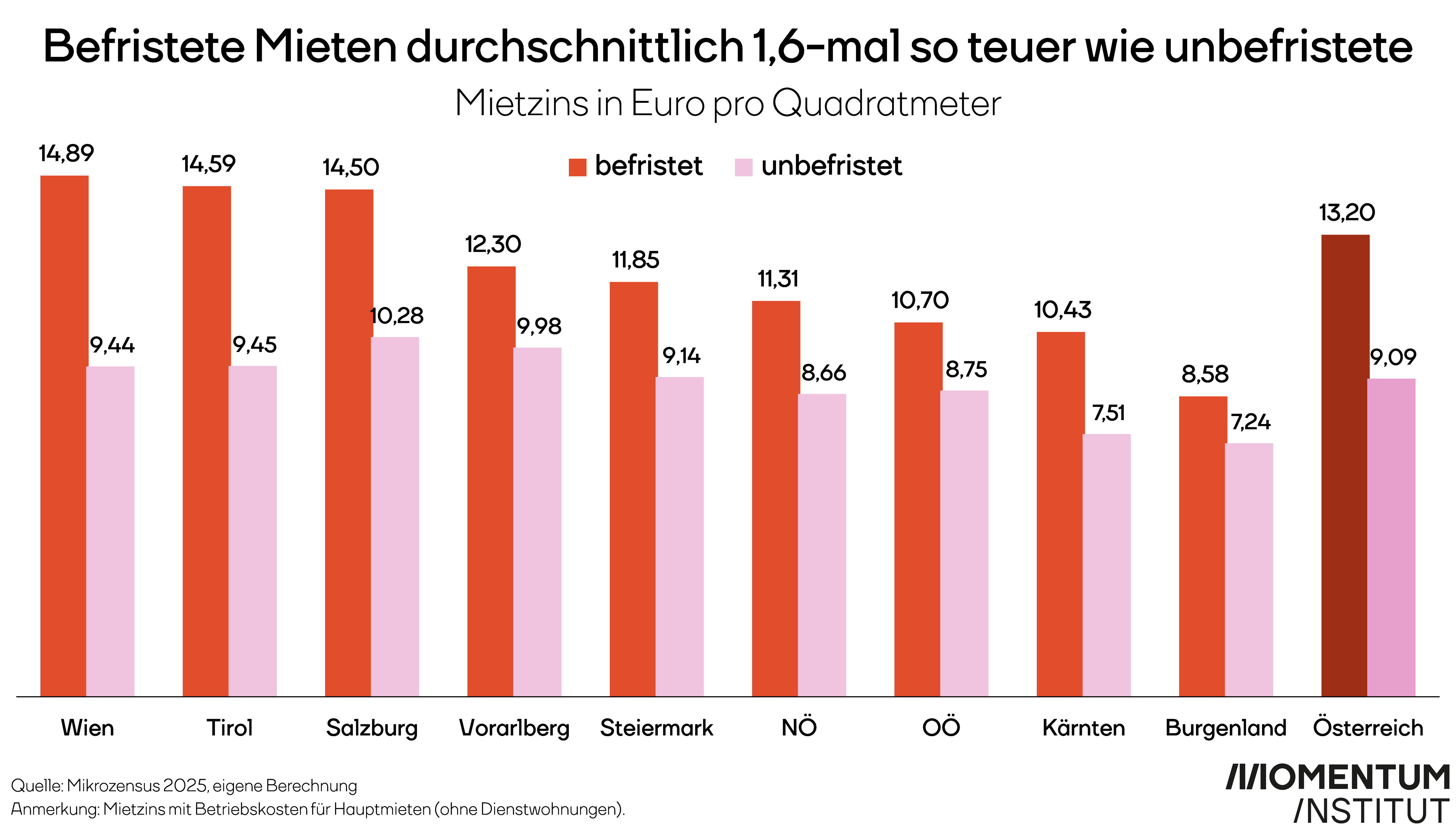 Basierend auf dem Mikrozensus 2025 zahlen Mieter:innen inklusive Betriebskosten in Österreich im Schnitt 13,20 Euro pro Quadratmeter für befristete Wohnungen und bezahlen damit 1,6-mal mehr als für unbefristete (9,09 Euro). In Wien ist die Differenz besonders deutlich bei 14,89 Euro (befristet) gegenüber 9,44 Euro (unbefristet). Den günstigsten Quadratmeterpreis zeigen die Daten mit 8,58 Euro (befristet) bzw. 7,24 Euro (unbefristet) im Burgenland, dort besteht auch die geringste Preisdifferenz zwischen den beiden Vertragslängen von allen Bundesländern.