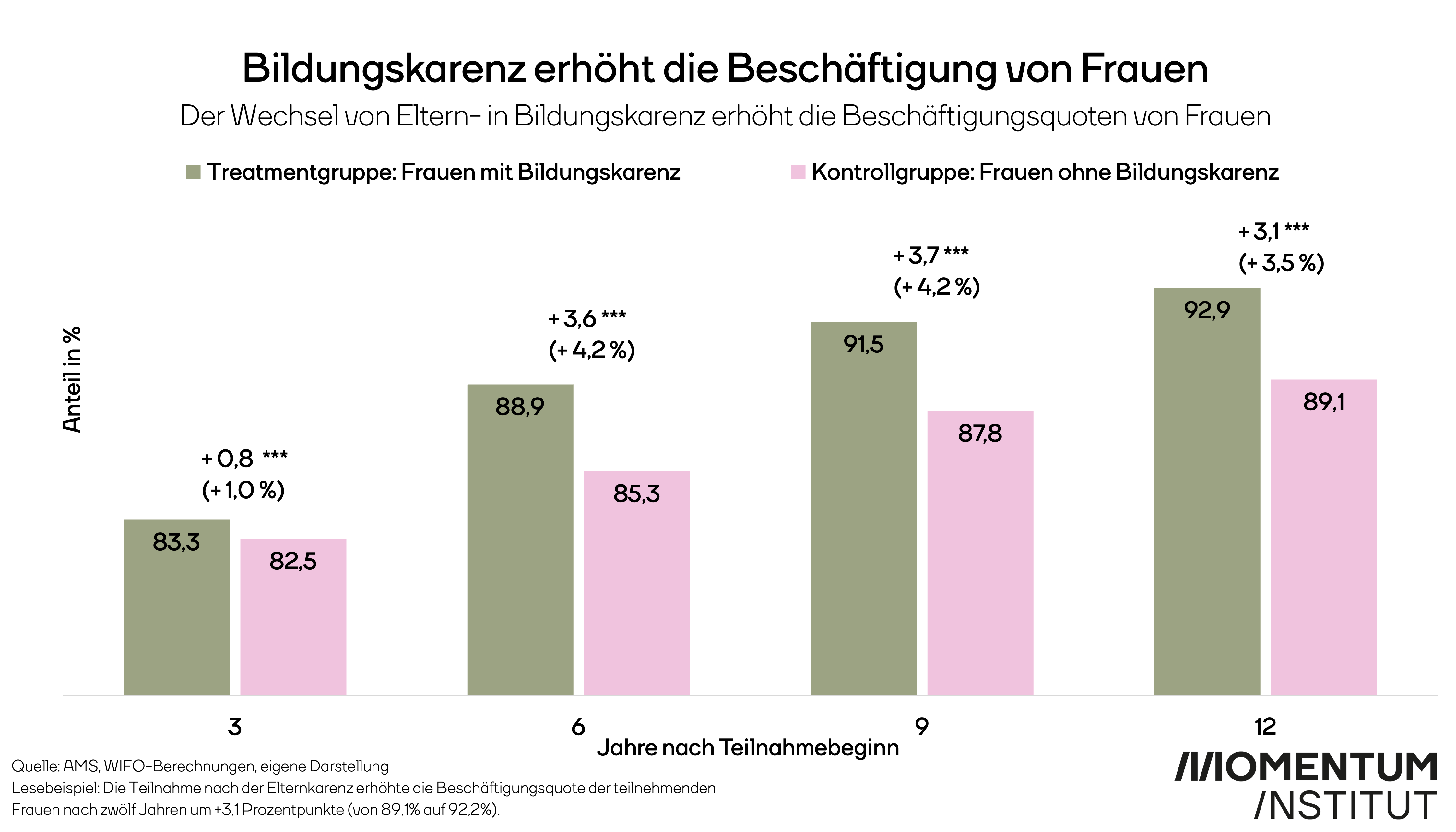 Empirische Studien zeigen, dass die bisherige Bildungskarenz gerade für Mütter eine Brücke zurück ins Berufsleben war. Zwölf Jahre nach Antritt lag die Beschäftigungsquote von Frauen mit Bildungskarenz um 3,1 Prozentpunkte höher als bei vergleichbaren Frauen ohne dieses Instrument.