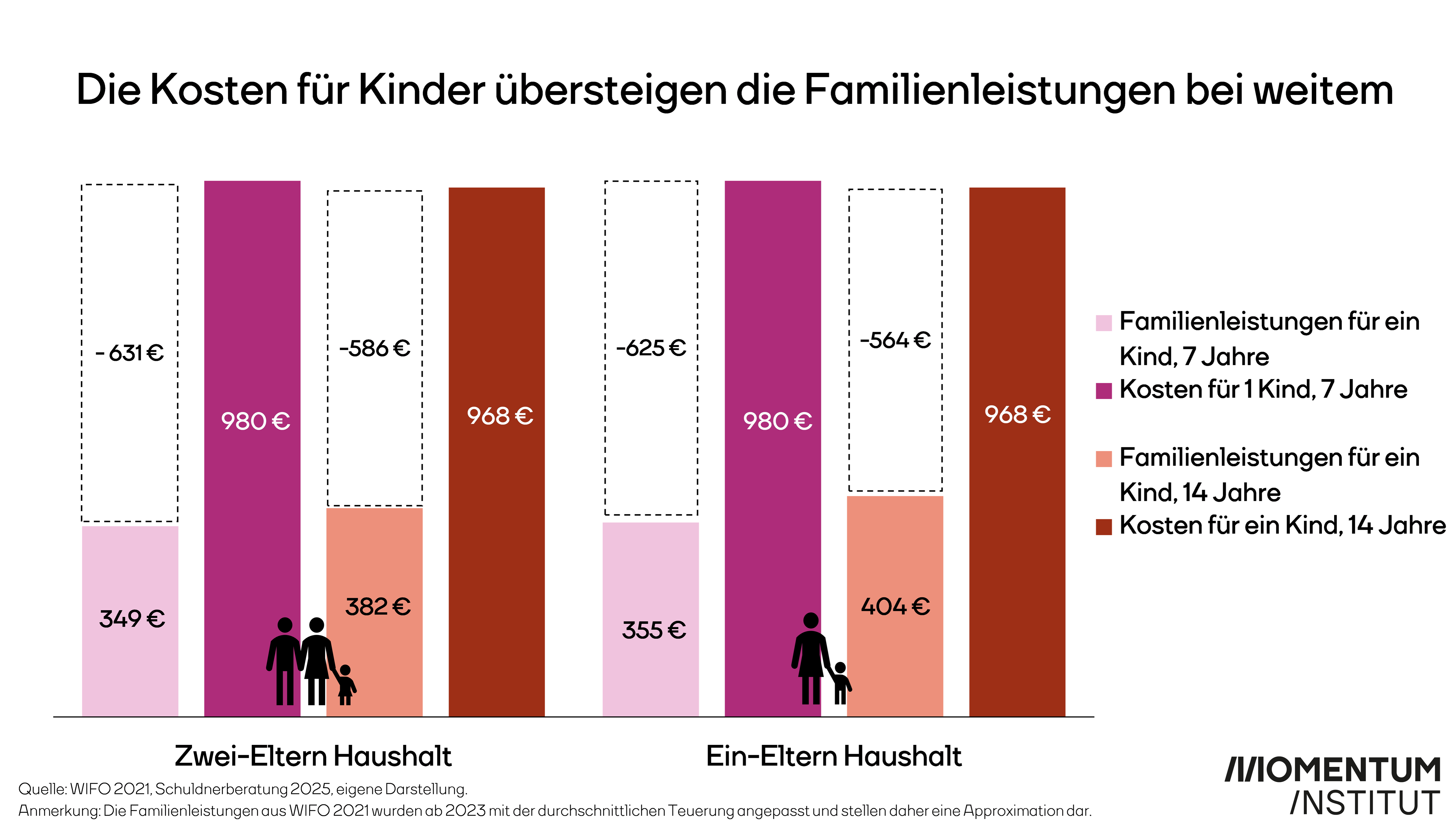 Eine Analyse der Familienleistungen zeigt: Selbst, wenn alle Familienleistungen, die in Österreich für Kinder ausbezahlt werden, also Familienbeihilfe, Kinderabsetzbetrag und Familienbonus zusammengerechnet werden, fehlen in allen Haushaltskonstellationen hunderte Euro, um die tatsächlichen Kosten für Kinder zu decken.
