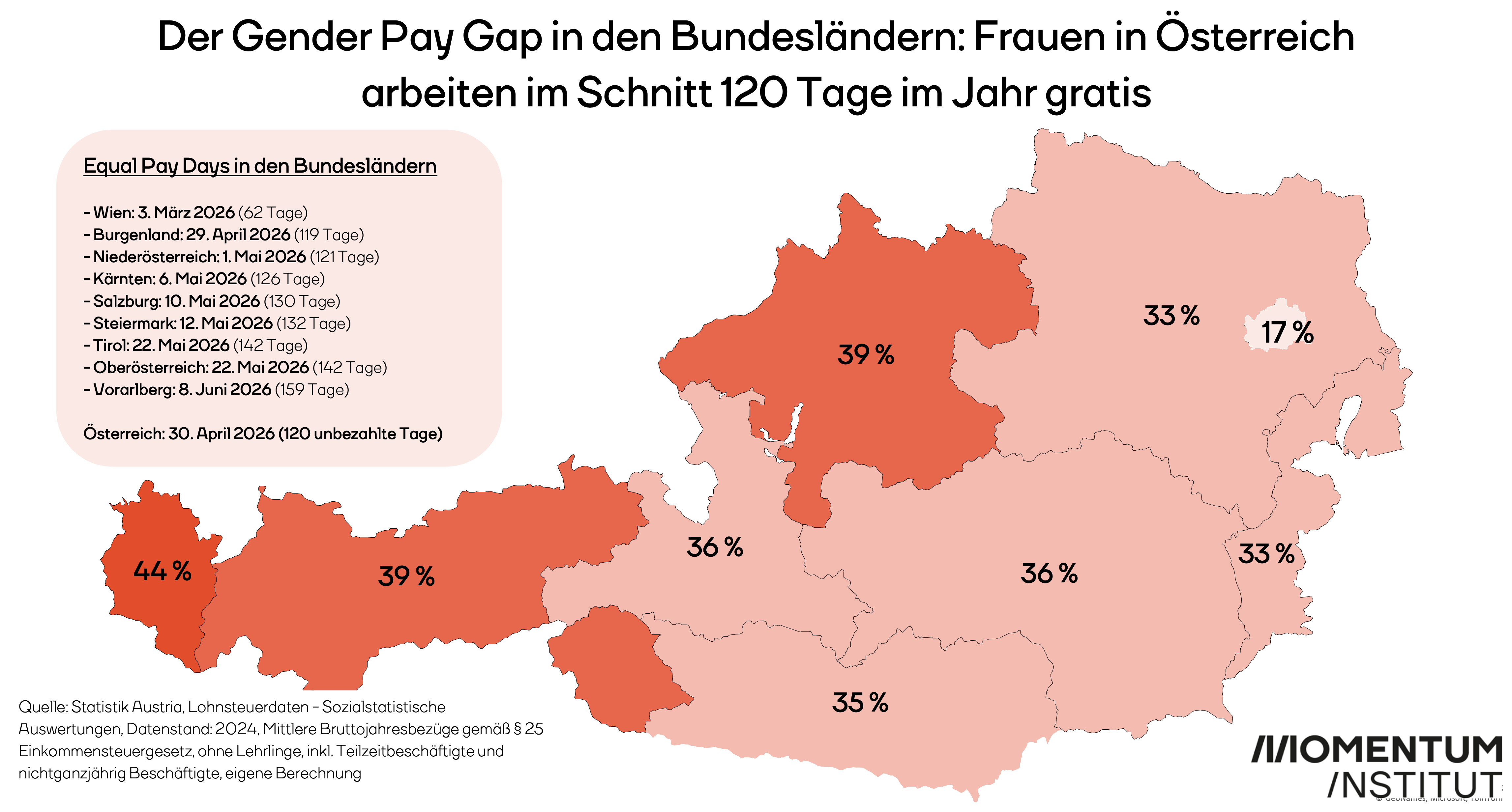 Der Gender Pay Gap in Wien liegt bei 17 Prozent und in Vorarlberg klafft die Lohnlücke zwischen voll- und teilzeitbeschäftigten Frauen und Männern bei satten 44 Prozent. Im Schnitt arbeiten Frauen (in Teilzeit oder Vollzeit) etwa 120 Tage im Jahr gratis.