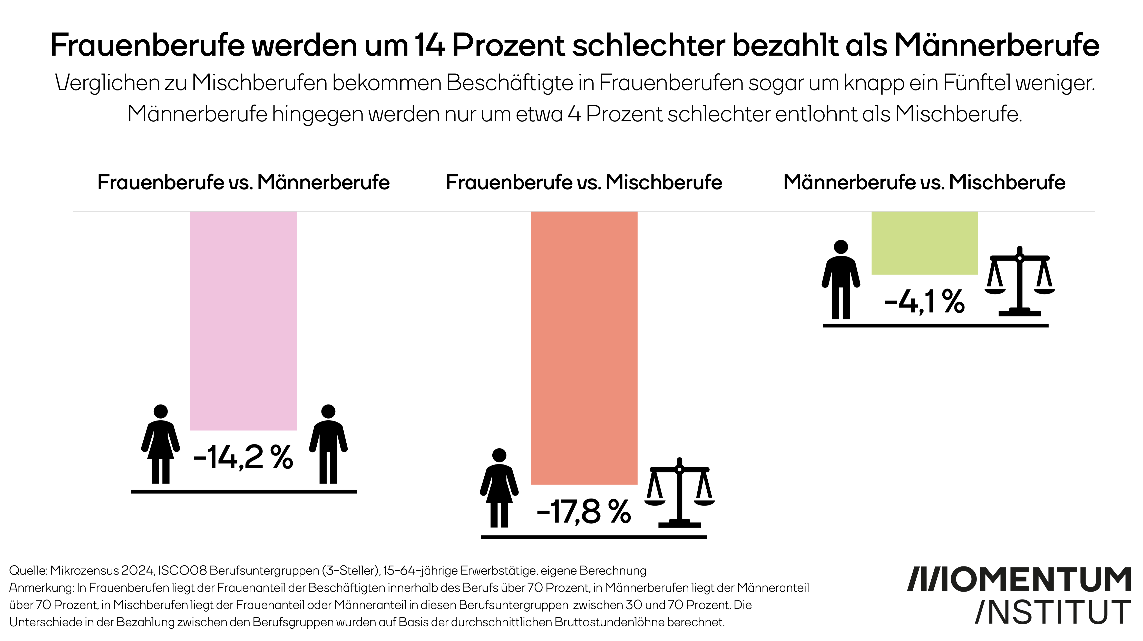 Frauenberufe werden schlechter bezahlt als Männerberufe. Werden die durchschnittlichen Bruttostundenlöhne aller Beschäftigten in den Frauen-, Männer- und Mischberufen miteinander verglichen, dann zeigt sich, dass Frauenberufe um 14 Prozent schlechter entlohnt werden als Männerberufe. Verglichen zu Mischberufen bekommen Beschäftigte sogar um knapp ein Fünftel (18 Prozent) weniger gezahlt. Männerberufe hingegen werden nur um etwa 4 Prozent schlechter entlohnt als Mischberufe.