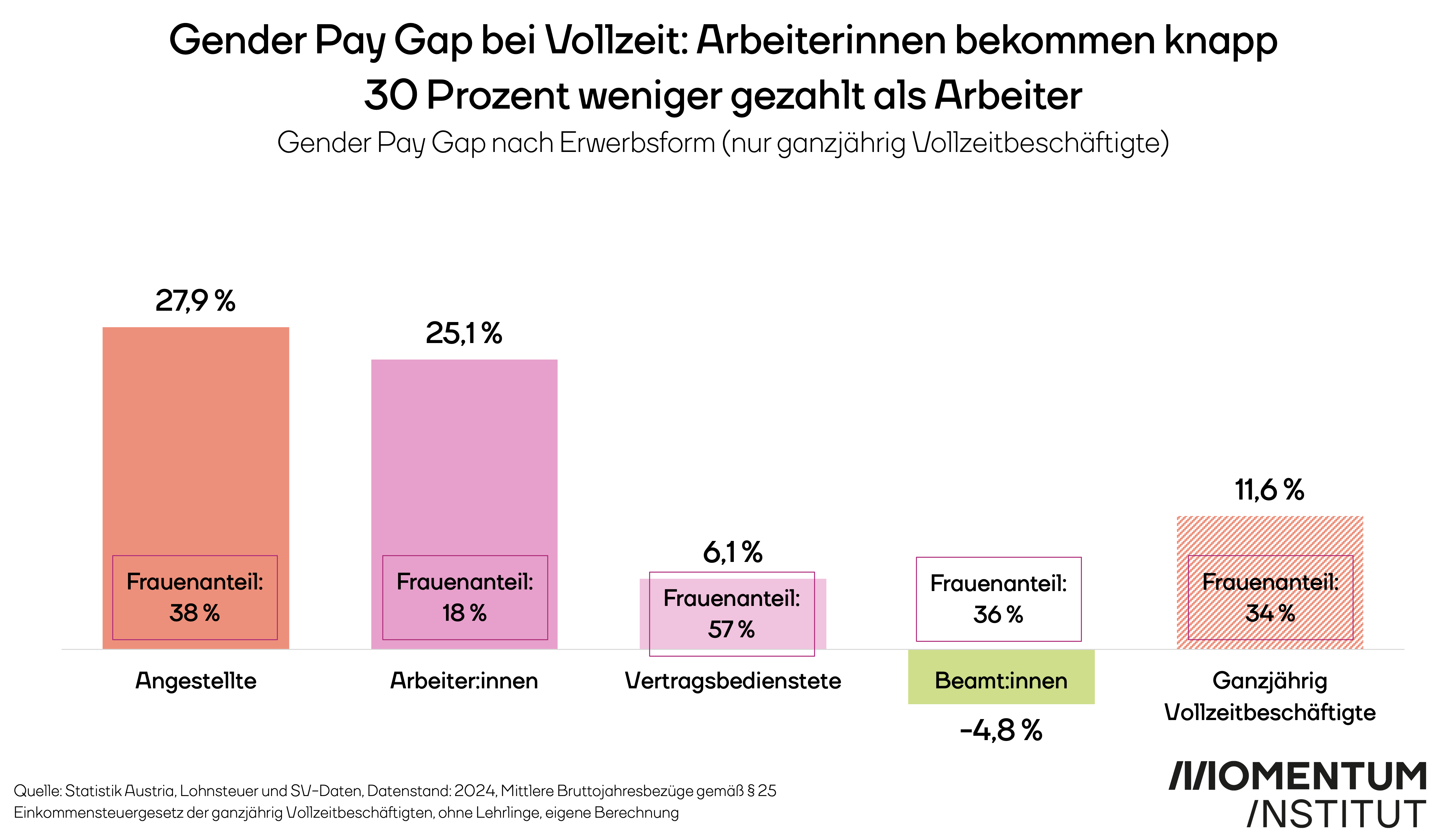 Der Gender Pay Gap variiert je nach Erwerbsform: Arbeiterinnen in Vollzeitbeschäftigung bekommen rund ein Viertel weniger gezahlt, Angestellte sogar knapp 28 Prozent weniger. Besonders der hohe Frauenanteil innerhalb der Gruppe der Angestellten – fast 40 Prozent der Angestellten sind weiblich – deutet auf eine Lohnlücke hin, die sich nur durch die unterschiedliche Betrachtung des Erwerbsausmaßes (Vollzeit oder Teilzeit) nicht so einfach „wegrechnen“ lässt.