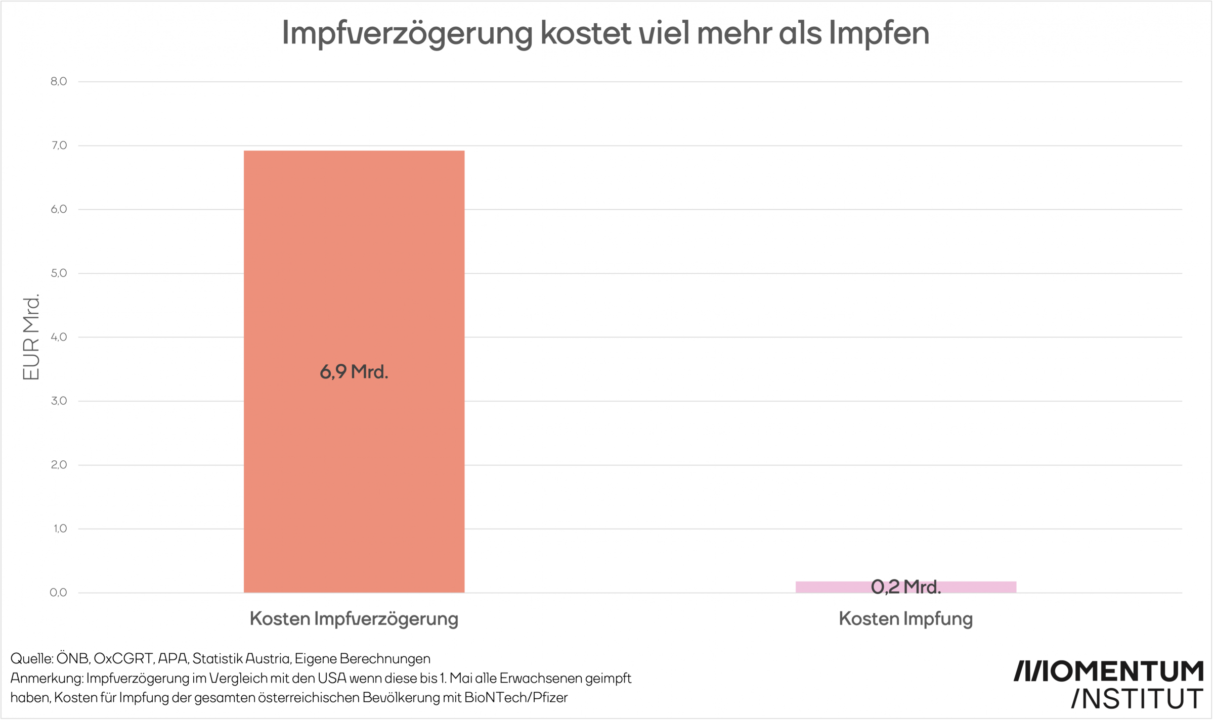 Zumindest 7 Milliarden Euro an Wohlstandsverlusten kostet allein Österreich die schleppende Impfkampagne. Bei einem Rückstand von rund vier Monaten (in Österreich ist mit einer Durchimpfung erst bis Ende August zu rechnen) werden weitere einschränkende Maßnahmen notwendig, die sich negativ auf das Bruttoinlandsprodukt auswirken.