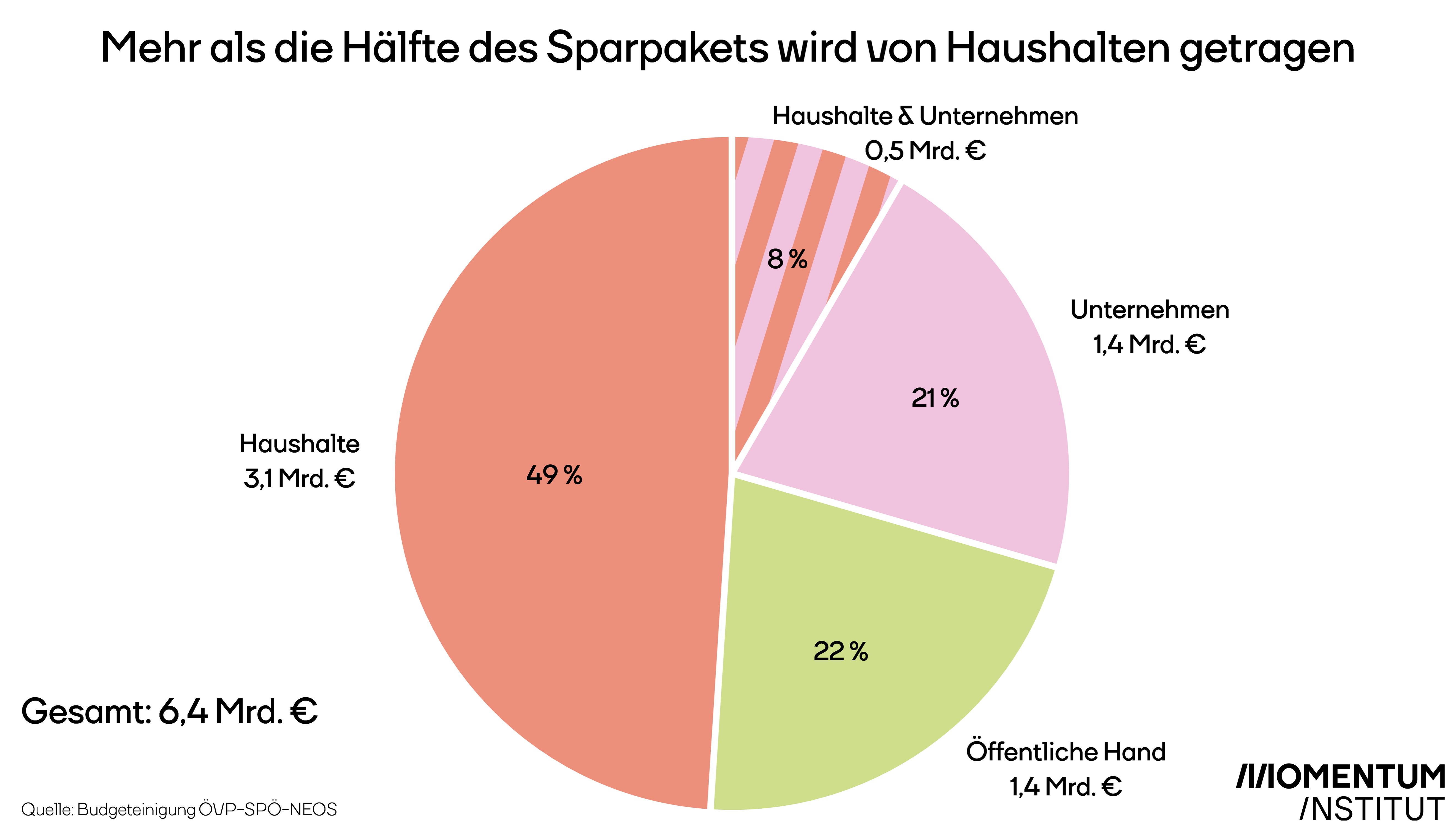 Besonders Haushalte sind stark betroffen: Sie tragen fast die Hälfte der geplanten Einsparungen dieses Jahr, während Unternehmen vergleichsweise geschont werden. Von 6,4 Milliarden des geplanten Sparpakets 2025 tragen die Haushalte 3,1 Milliarden Euro an Ausgabenkürzungen und Steuererhöhungen. Unternehmen müssen 1,4 Milliarden schlucken, ähnlich viel wie die Öffentliche Hand. Haushalte und Unternehmen gemeinsam sind von einer halben Milliarde Euro an Einsparungen betroffen. Für Unternehmen gibt es trotz Sparpaket sogar Steuerzuckerl. Die Rücknahme der Steuersenkung auf Unternehmensgewinne der Vorgänger-Regierung wäre als Beitrag zur Budgetsanierung sinnvoller gewesen.