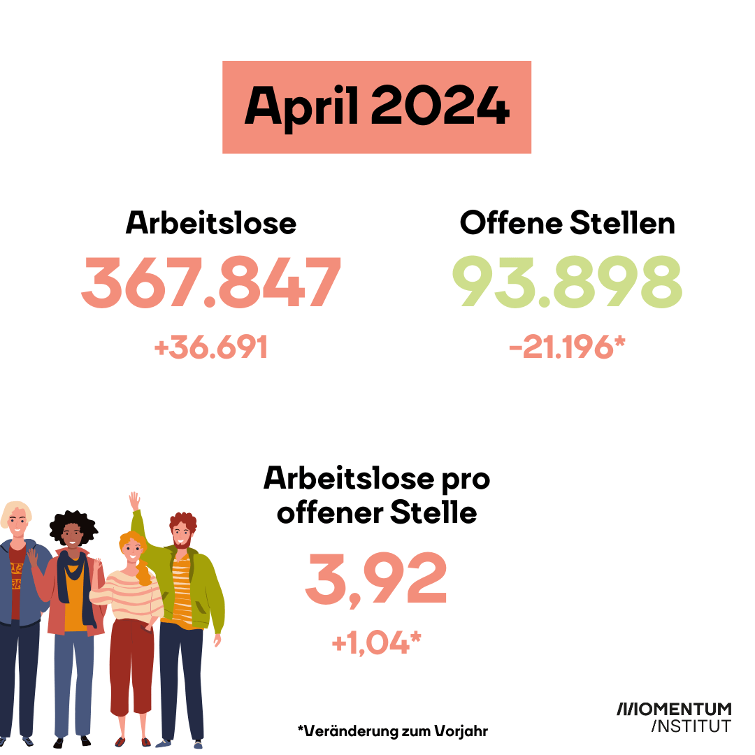 Die Lage am österreichischen Arbeitsmarkt verschlechterte sich im vergangenen Monat weiter. Im April 2024 ist die Arbeitslosigkeit in Österreich um 11 Prozent gegenüber dem Vorjahr gestiegen. Insgesamt waren etwa 370.000 Menschen ohne Beschäftigung. Die Arbeitslosenquote hat sich somit auf 8,6 Prozent erhöht. Dem gegenüber stehen rund 95.000 offene Stellen, rund 20.000 weniger als noch vor einem Jahr. Das Verhältnis von Arbeitslosen zu offenen Stellen verschlechtert sich damit erneut. Auf eine offene Stelle kommen aktuell im Schnitt 3,9 Arbeitslose. Vor einem Jahr waren es im Schnitt nur 2,9.