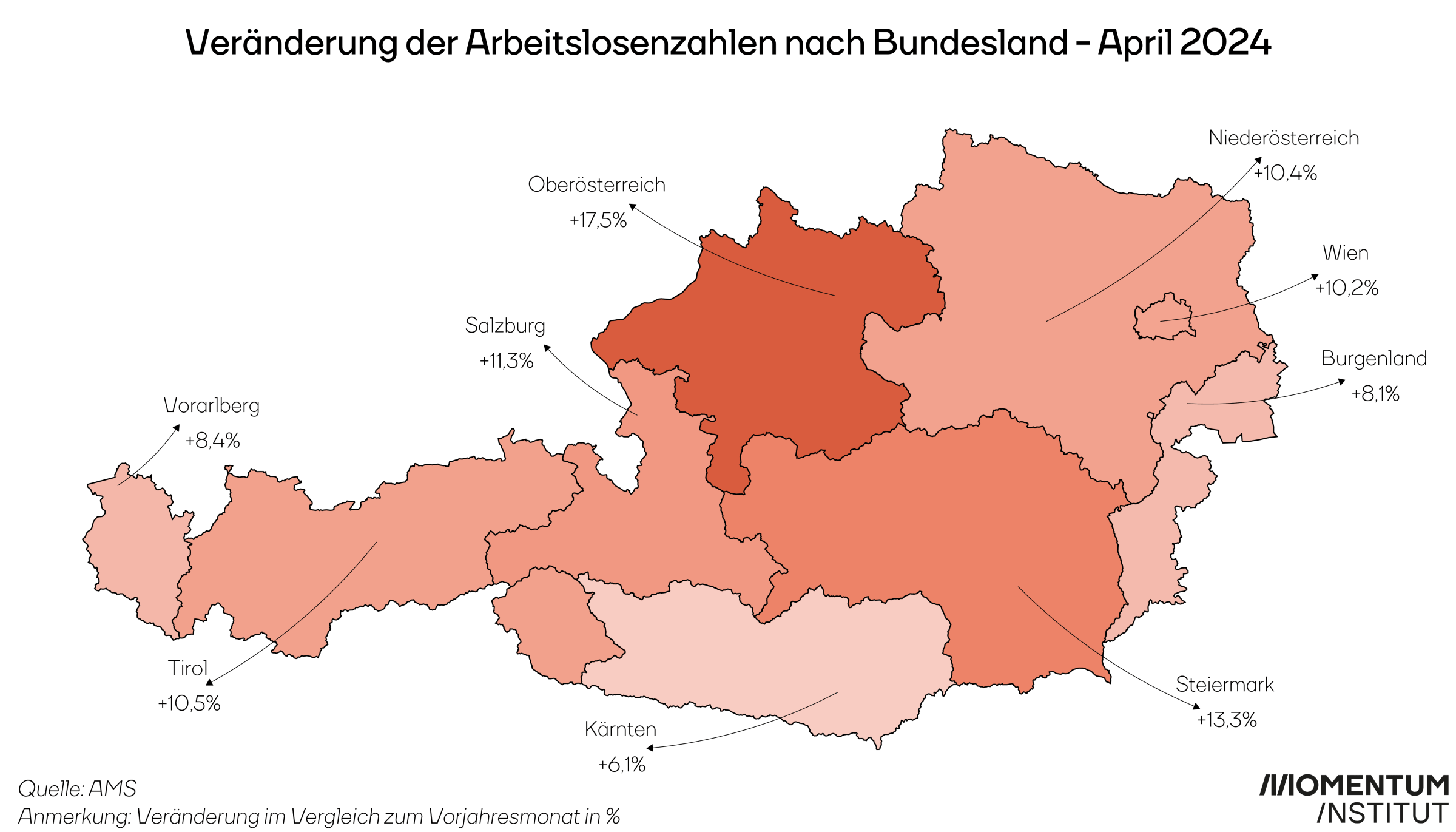 Der starke Anstieg der Arbeitslosigkeit in der Industrie schlägt sich auch auf die regionalen Unterschiede durch. Oberösterreich, ein Bundesland, das für seine Industrieregionen bekannt ist,  verzeichnet mit 17,5 Prozent den stärksten Anstieg der Arbeitslosigkeit. Die Steiermark schneidet mit einem Anstieg von 13,3 Prozent am schlechtesten ab. Im Gegensatz dazu weist Kärnten mit einem Anstieg von 6,1 Prozent den geringsten Anstieg auf.