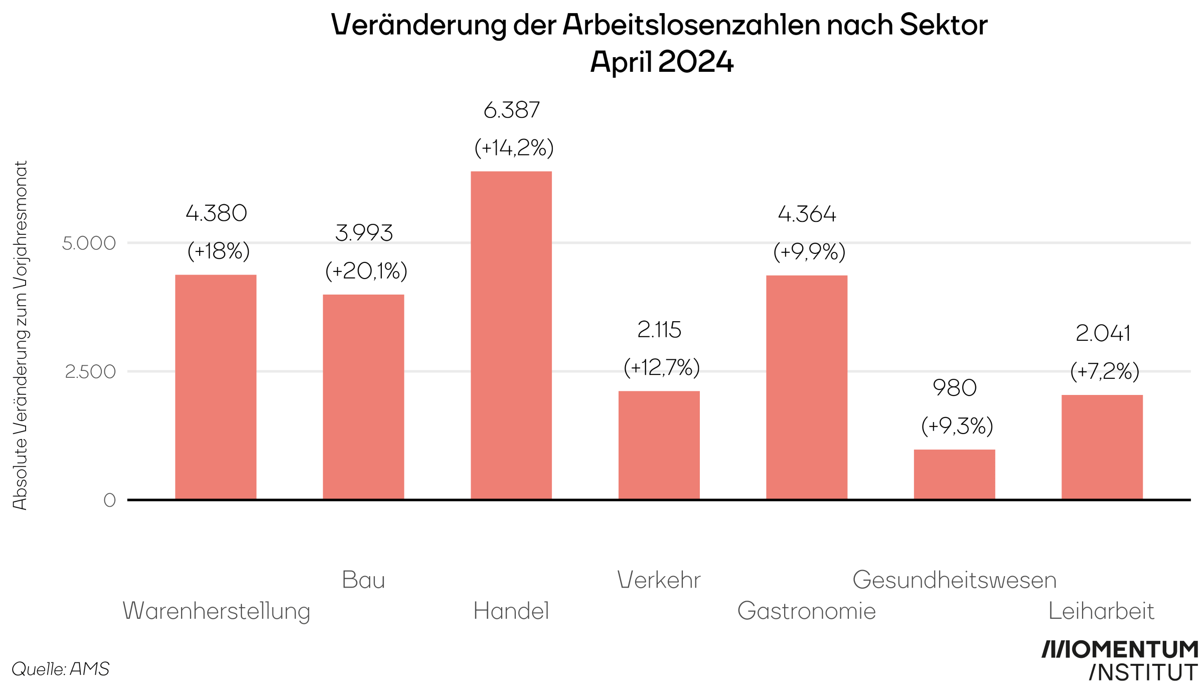 Die Zunahme der Arbeitslosigkeit betrifft alle Wirtschaftssektoren, wobei die Baubranche mit einem Anstieg von 20 Prozent am härtesten getroffen ist. Die hohen Zinsen der EZB beeinträchtigen vor allem die kreditfinanzierten Bauprojekte. Trotz des von der Regierung vorgestellten Bau-Konjunkturpakets zur Stärkung der Nachfrage bleibt eine spürbare Verbesserung bislang aus. Auch die Industrie verzeichnet mit 18 Prozent einen signifikanten Anstieg der Arbeitslosigkeit. Im Handel sind die meisten Menschen vom Anstieg der Arbeitslosigkeit betroffen. Rund 6.400 Menschen mehr als vor einem Jahr sind aktuell aus der Handelsbranche erwerbsarbeitslos.