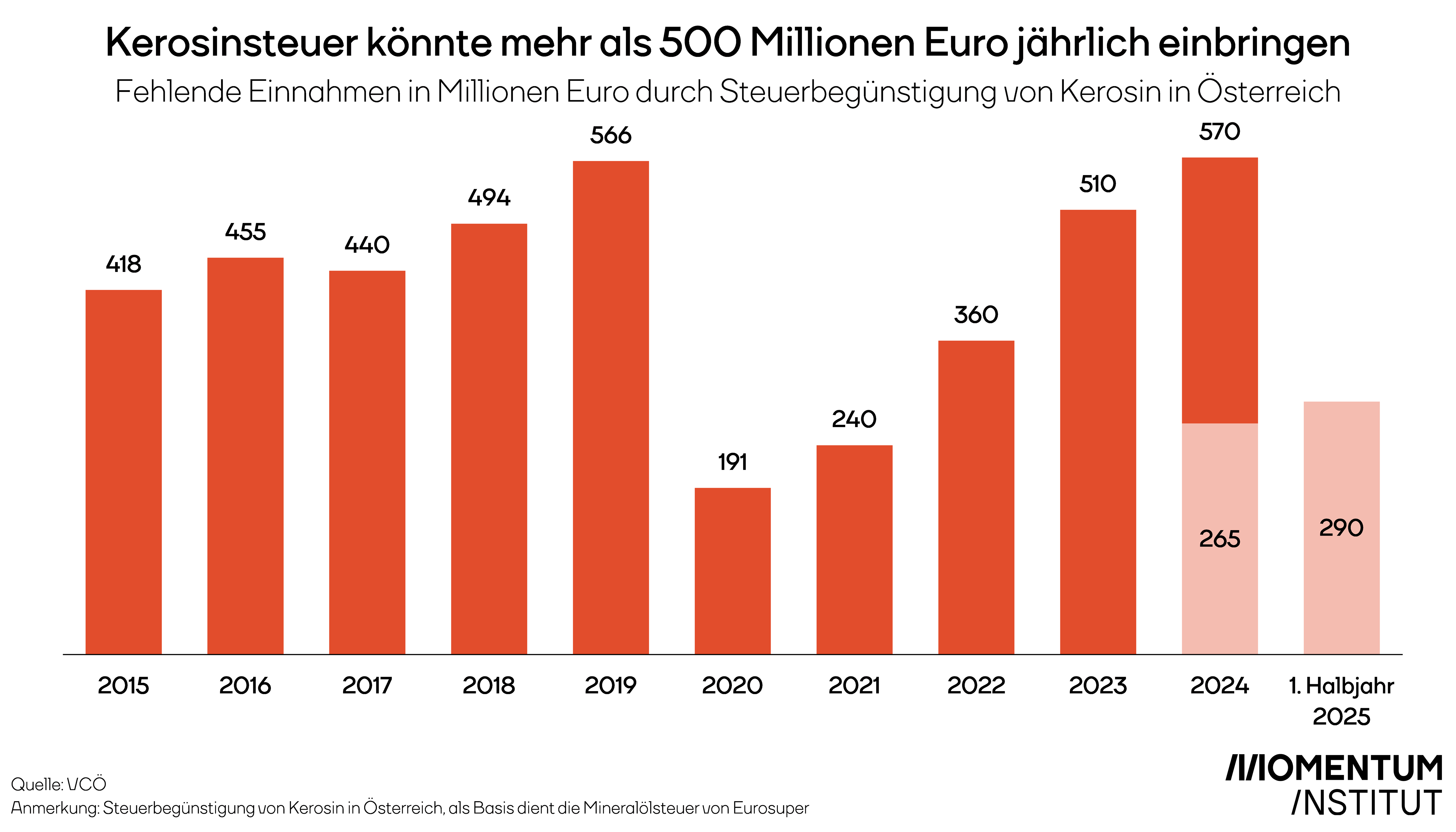 Nach wie vor ist Kerosin in der gewerblichen Luftfahrt von der Mineralölsteuer befreit. In Zeiten der sich zunehmend verschärfenden Klimakrise gekoppelt mit der budgetär maroden Lage in Österreich liegt es auf der Hand, Maßnahmen, die unsere Umwelt zerstören nicht weiter mit Steuergeld zu fördern. Eine Aufhebung der Steuerbefreiung von Kerosin kann jährlich 580 Millionen Euro bringen. Die potenziellen Einnahmen einer Kerosin-Besteuerung sind angelehnt an die Berechnung des VCÖ basierend auf der Mineralölsteuer von Eurosuper und entsprechen einer Hochrechnung der möglichen Einnahmen des 1. Halbjahrs 2025.