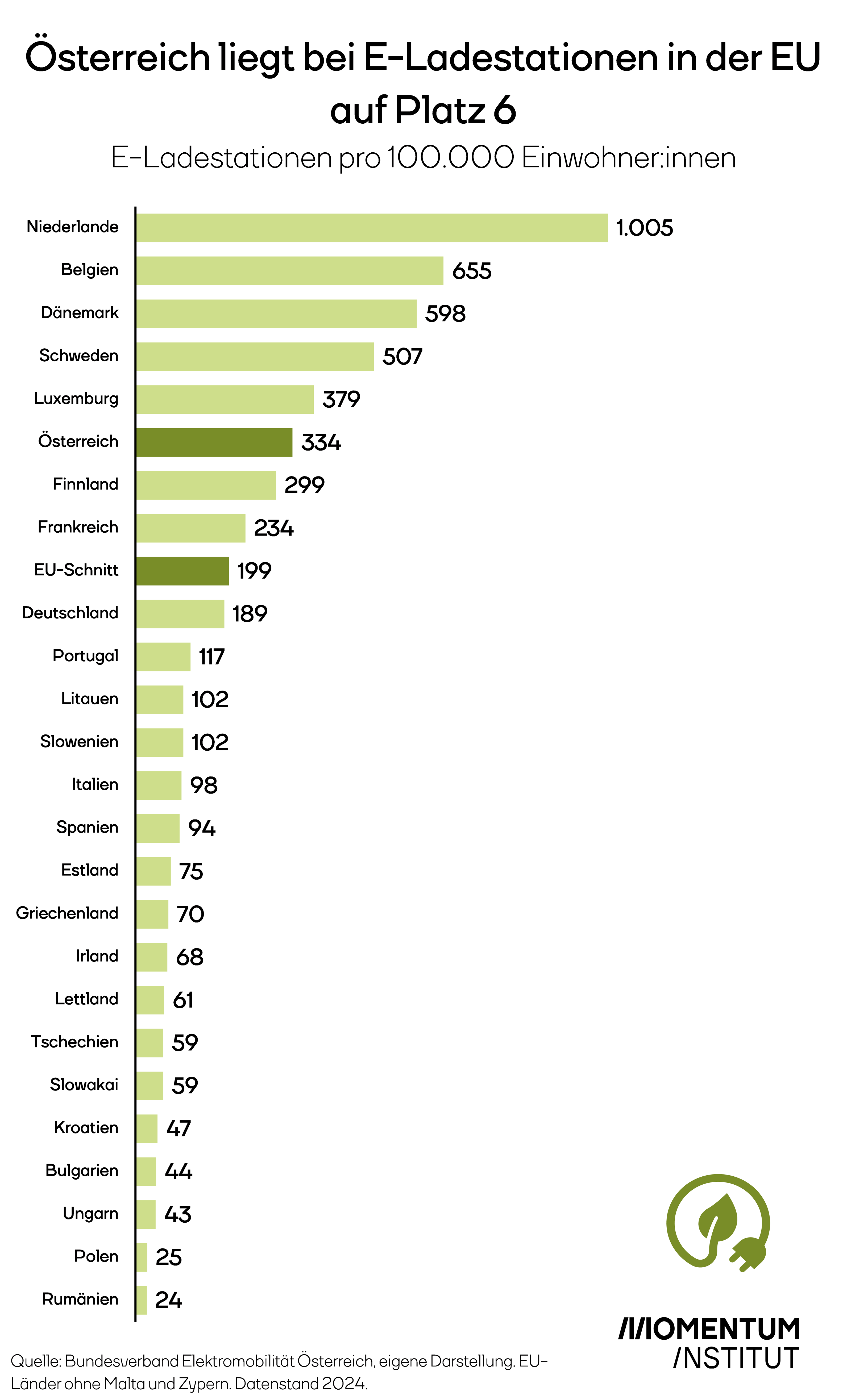 In der EU stehen in den Niederlanden pro 100.000 Einwohner:innen 1.005 Ladepunkte zur Verfügung, gefolgt von Belgien (655), Dänemark (598), Schweden (507) und Luxemburg (379). Österreich kommt auf 334 Ladepunkte, während der EU-Schnitt bei 199 liegt. Das Schlusslicht hinsichtlich Ladeinfrastruktur bilden Ungarn (43), Polen (25) und Rumänien (24).
