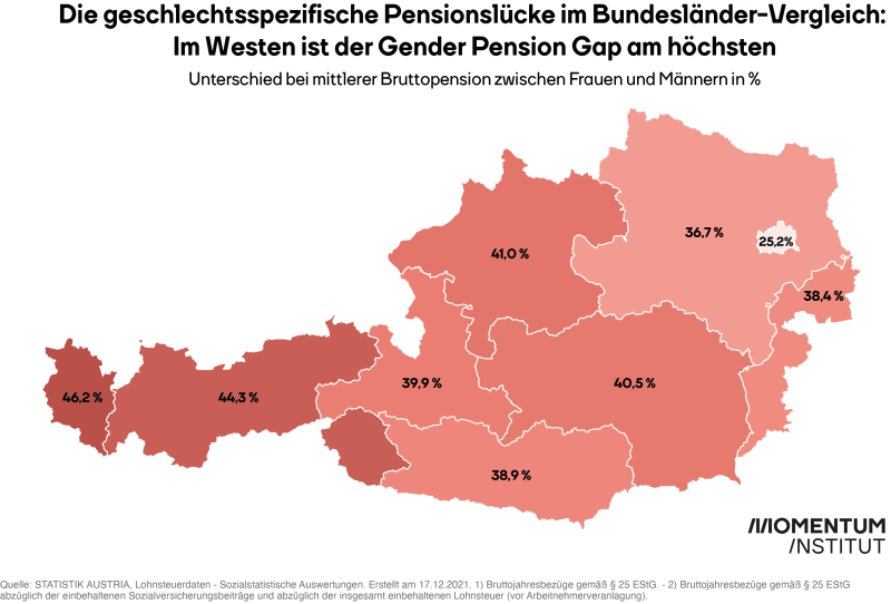 Der Bundesländervergleich zeigt große Unterschiede beim Gender Pension Gap. Mit großem Abstand am niedrigsten ist der Geschlechterunterschied bei den Pensionen in Wien (25,2 Prozent), am höchsten in Vorarlberg mit 46,2 Prozent und Tirol mit 44,3 Prozent.