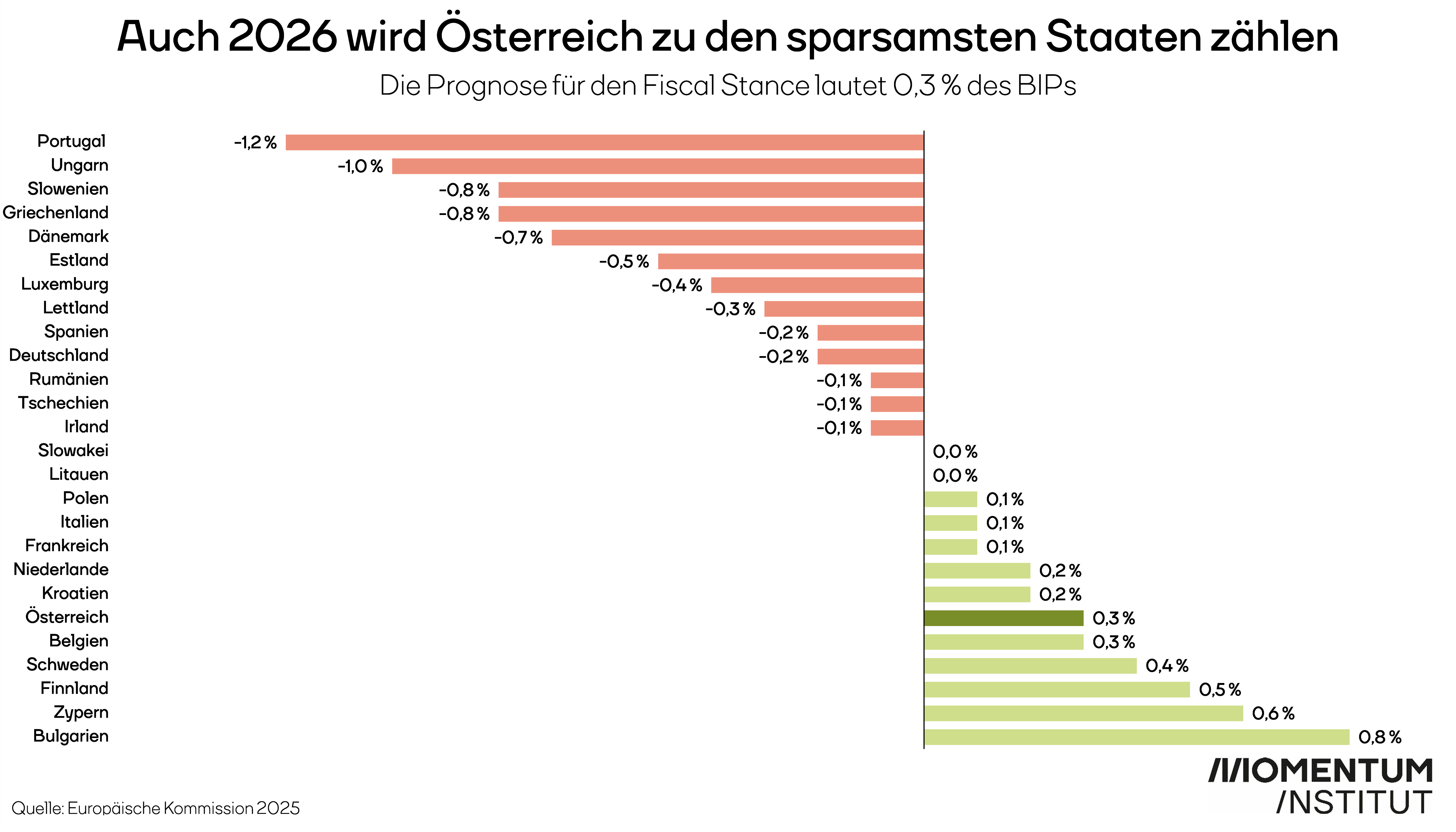 Österreich fährt heuer einen der schärfsten Sparkurse Europas. Das zeigt unsere aktuelle Analyse basierend auf Daten der Europäischen Kommission. Der „Fiscal Stance“, ein Maß für die gesamtstaatliche Budgetausrichtung, belegt, dass Österreich mit einem Fiscal Stance von 1,3 Prozent 2025 zu den Ländern mit der restriktivsten Fiskalpolitik zählt.