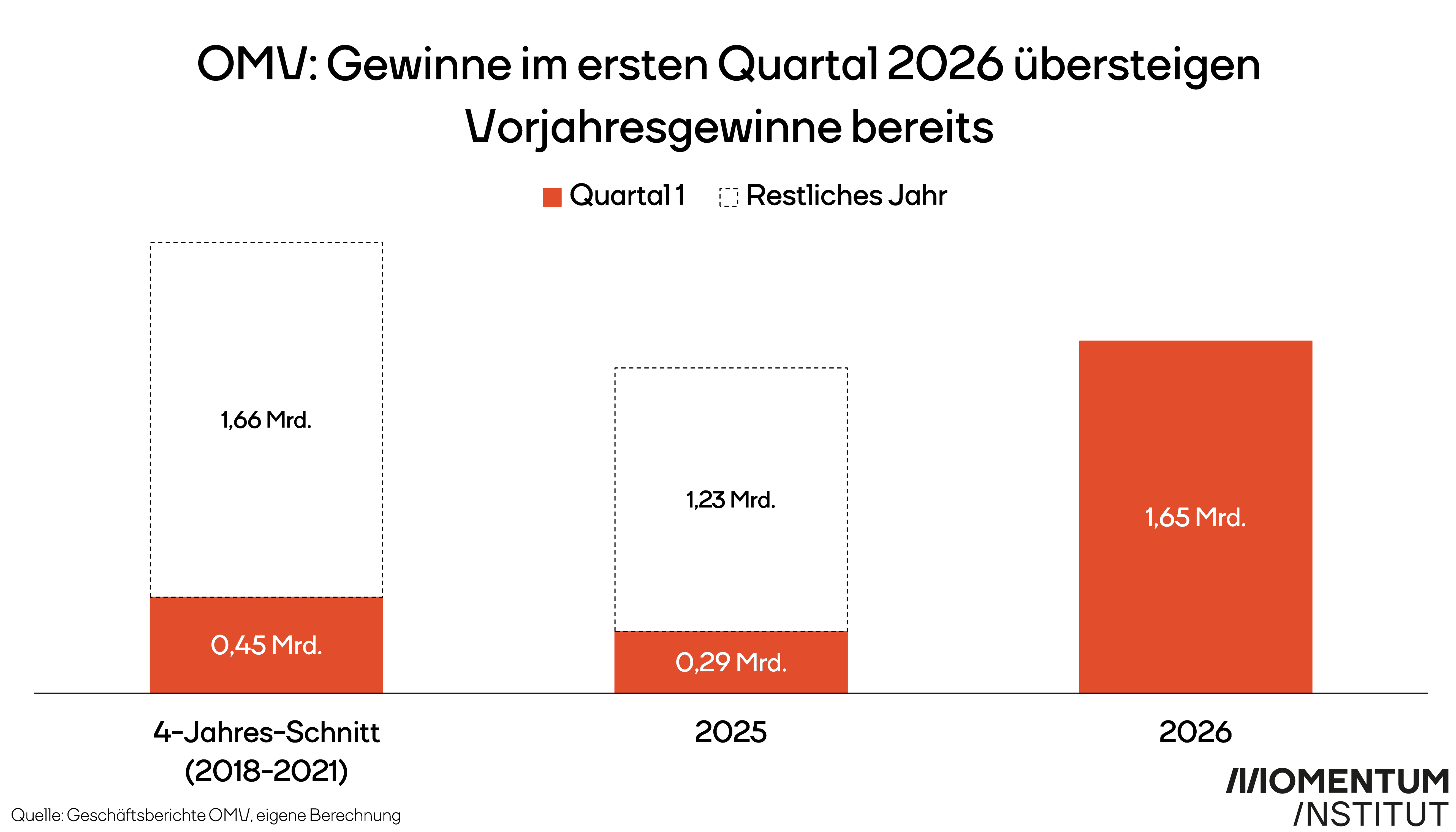 Allein im ersten Quartal 2026 erzielte die OMV ein Periodenergebnis von 1,65 Milliarden Euro. Das ist mehr als dreieinhalbmal so viel wie der Durchschnitt der ersten Vorkrisen-Quartale 2018 bis 2021. Um an die durchschnittlichen Jahresgewinne aus den Vorkrisenjahren heranzukommen, fehlt der OMV heuer somit nur noch 461 Millionen Euro. Den gesamten Jahresgewinn 2025 in Höhe von 1,52 Milliarden Euro, hat die OMV heuer bereits im ersten Quartal erreicht.