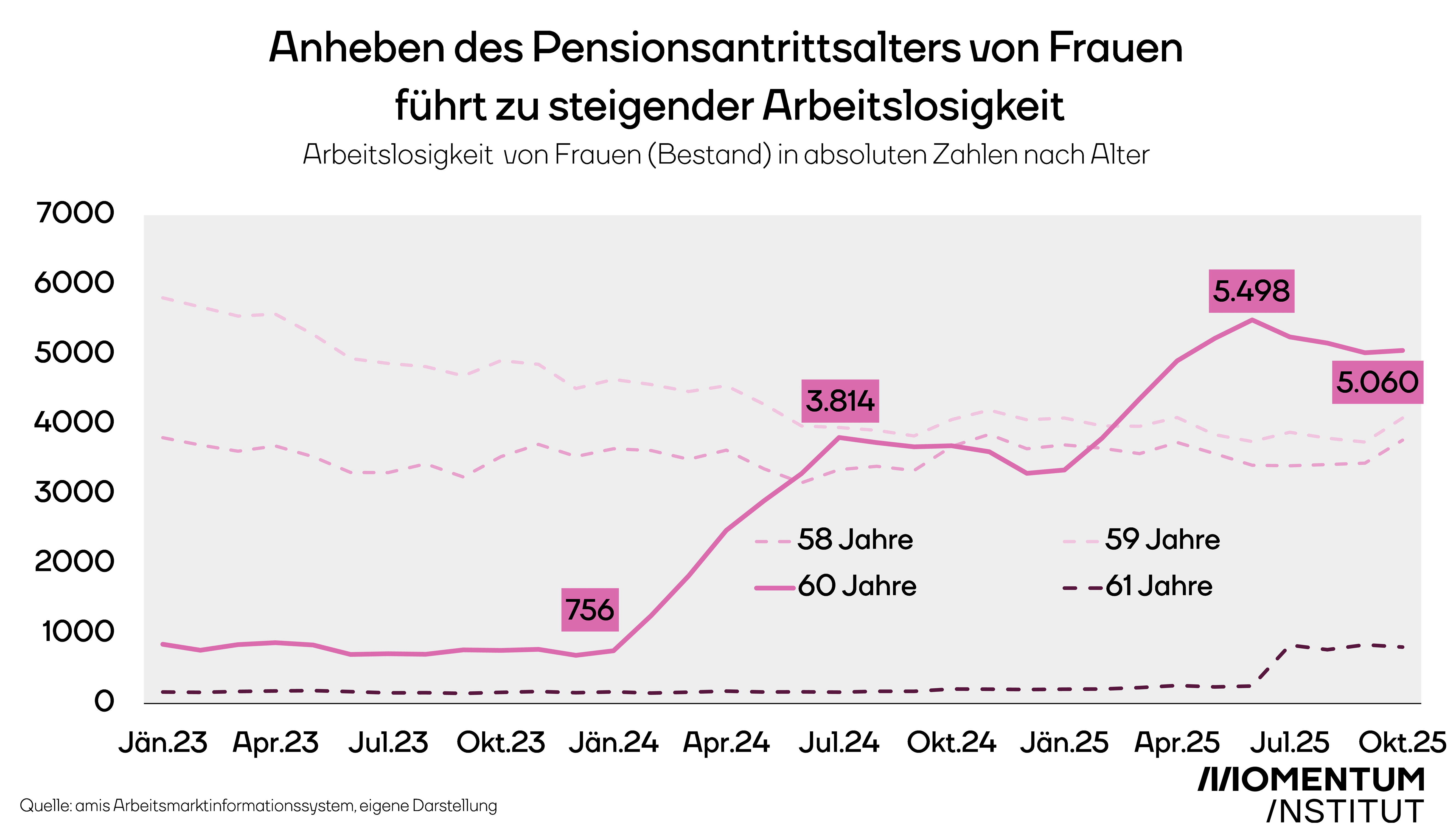 Die Analyse von Daten des AMS offenbart den sprunghaften Anstieg der Arbeitslosigkeit unter 60-jährigen Frauen: Noch vor der ersten Anhebung des Pensionsantrittsalters von Frauen mit 1. Januar 2024 war der Bestand arbeitsloser 60-jähriger Frauen gering. Bis Juli 2024, nachdem der erste Frauenjahrgang mit einem halben Jahr Verzögerung in Pension gehen durfte, stieg diese Zahl auf 3.814 Personen. Im Frühjahr 2025 waren es bereits 5.498 Personen. Zuletzt im Oktober 2025 waren es 5.060 arbeitslose 60-jährige Frauen.