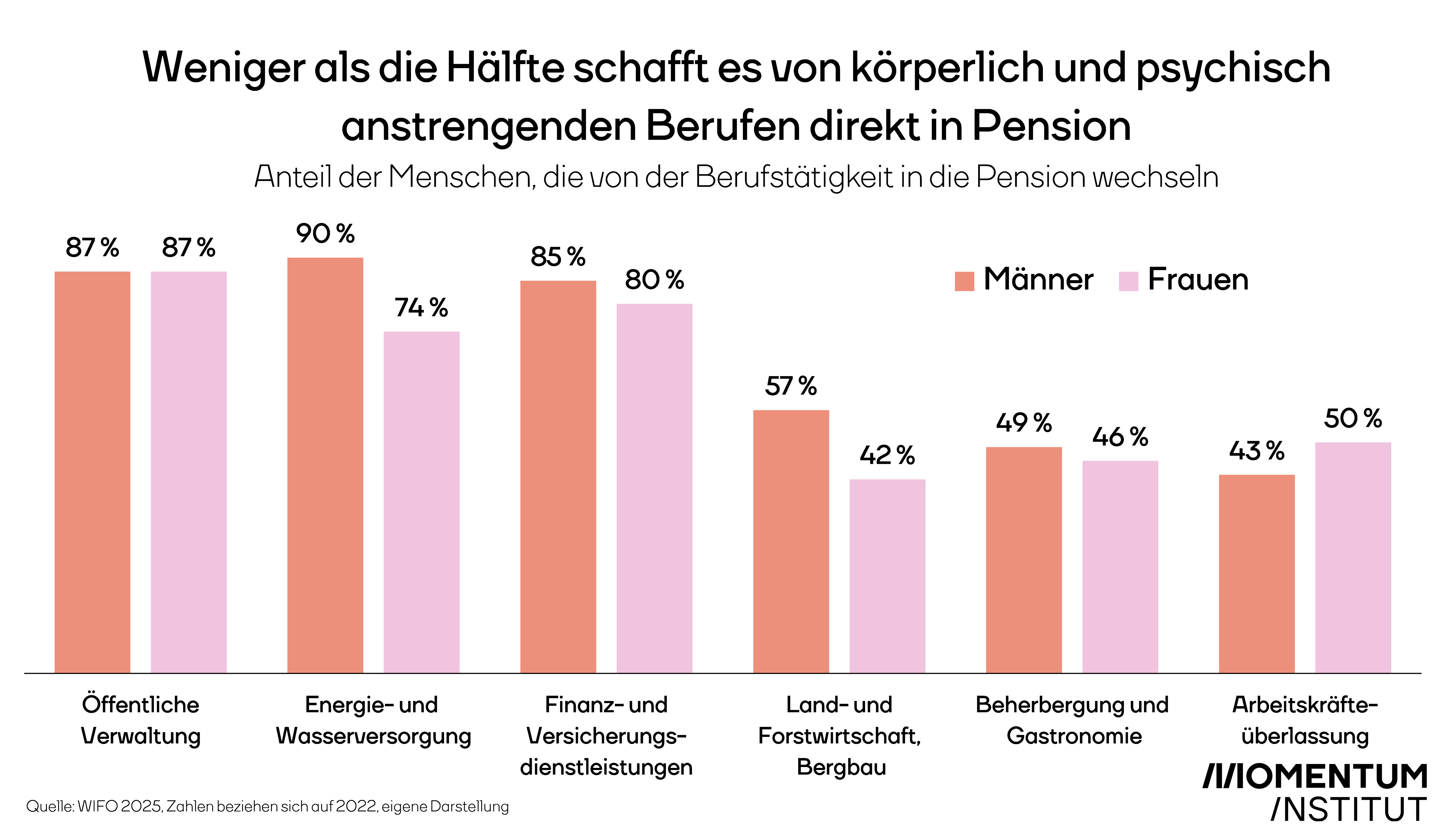Etliche Menschen schaffen es nicht vom Job direkt in die Pension zu gehen. Gerade in körperlich oder psychisch anstrengenden Branchen gelingt das weniger als der Hälfte, wie Daten des WIFO zeigen. In der Beherbergung und Gastronomie schafft es weniger als jede:r zweite Beschäftigte direkt in Pension (49 Prozent der Männer, 46 Prozent der Frauen). Die Branchen der Arbeitskräfteüberlassung (43 Prozent der Männer, 50 Prozent der Frauen) oder der Land- und Forstwirtschaft sowie Bergbau (57 Prozent der Männer, 42 Prozent der Frauen) zeigen ein ähnliches Bild. Im Bauwesen (nicht in Grafik ersichtlich) gehen nur 45 Prozent der Männer von der Beschäftigung direkt in den Ruhestand.