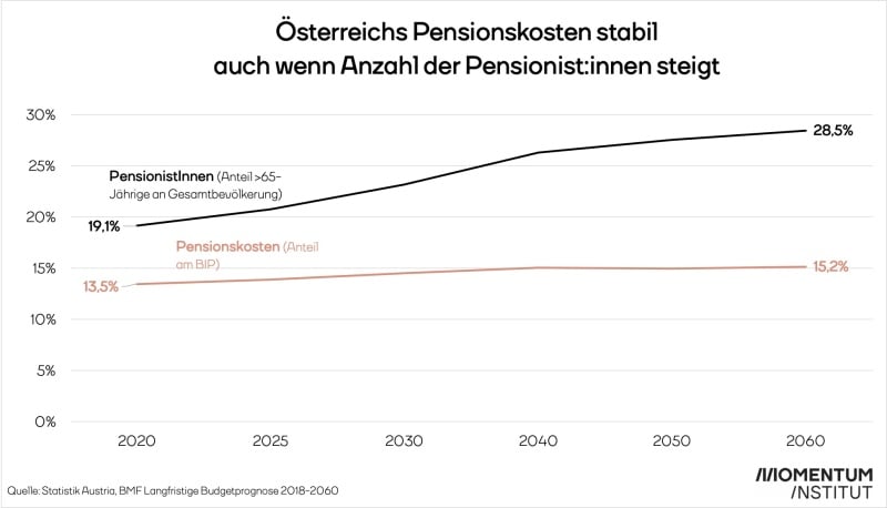 Im Diskurs um den Sozialstaat kommt, obwohl er Armut und Ungleichheit effektiv reduziert, oft die Frage der Finanzierbarkeit auf. Besonders das Pensionssystem steht hier häufig in der Kritik, auch, weil es einen großen Teil der Sozialleistungen ausmacht. Während es stimmt, dass mit den Baby-Boomern bald eine große Bevölkerungsgruppe in Pension gehen wird, ist jedoch keine „Kostenexplosion“ zu befürchten, denn: Eine Prognose des Bundesministeriums für Finanzen zeigt, dass die Kosten für das Pensionssystem trotz steigender Anzahl der Pensionist:innen sehr stabil bleiben. Zwischen 2020 und 2060 werden sie um nur 1,7 Prozentpunkte ansteigen.