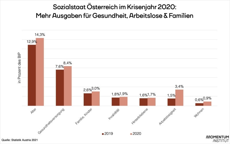 Die neuen Zahlen zu den Sozialleistungen sind da. Sie zeigen, dass der Sozialstaat Österreich im letzten Jahr höhere Gesundheitsausgaben als noch im Jahr davor leistete. Zudem sind die Pensionskosten gemessen am Bruttoinlandsprodukt (BIP) gestiegen und es ging mehr Geld an Familien, Arbeitslose und an Kurzarbeiter:innen (ebenfalls in der Kategorie „Arbeitslose“). Wie ist dieser Anstieg einzuordnen? Warum sind Sozialleistungen wichtig und sind hohe Sozialleistungen ein Problem oder ihr Anstieg in einem Krisenjahr sogar gut?