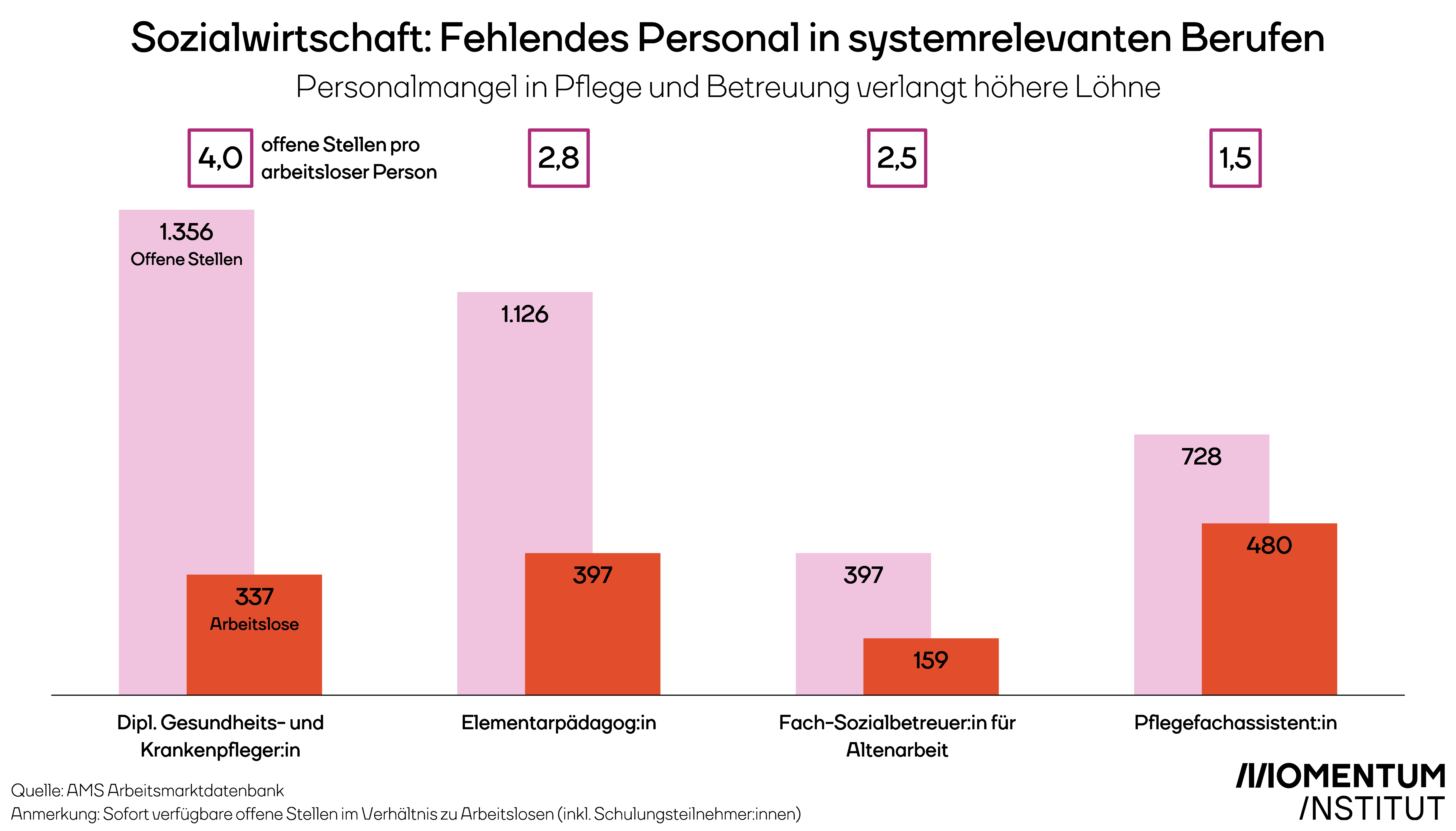 In der Sozialwirtschaft und bei der Eisenbahn ist der Personalengpass deutlich größer als im Durchschnitt aller Branchen. In einigen systemrelevanten Berufen aus Pflege und Betreuung ist die Zahl der offenen Stellen sogar um ein Vielfaches größer als die der verfügbaren Arbeitssuchenden. Das zeigt eine Auswertung des Momentum Instituts auf Basis der Arbeitsmarktdatenbank des AMS.