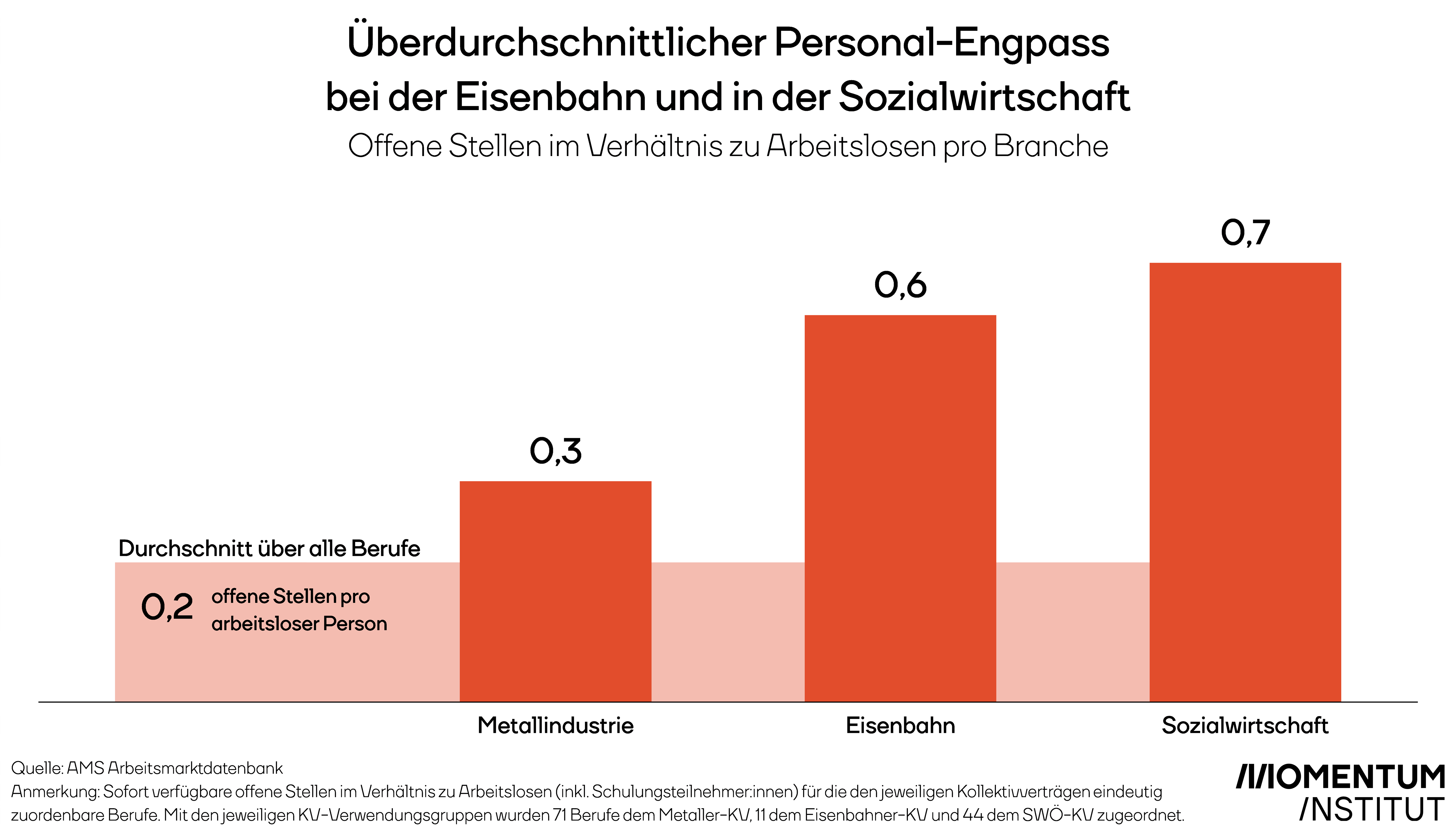 Im Branchenvergleich verdeutlicht sich die besondere Lage der Sozialwirtschaft. Österreichweit bestehen über alle Berufe hinweg im Schnitt 0,2 offene Stellen pro arbeitsloser Person. Bei den Metaller:innen liegt der Wert mit 0,3 nur knapp darüber. Deutlich mehr Personalengpass besteht in den zwei Branchen, die heute ihre Kollektivverträge verhandeln. Bei den Eisenbahner:innen beträgt das Verhältnis von offenen Stellen zu Arbeitslosen mit 0,6 dreimal so viel wie im Österreich-Schnitt. Die Sozialwirtschaft liegt mit einer Relation von 0,7 sogar darüber. Die Personalengpässe in der Sozialwirtschaft sind damit überdurchschnittlich.
