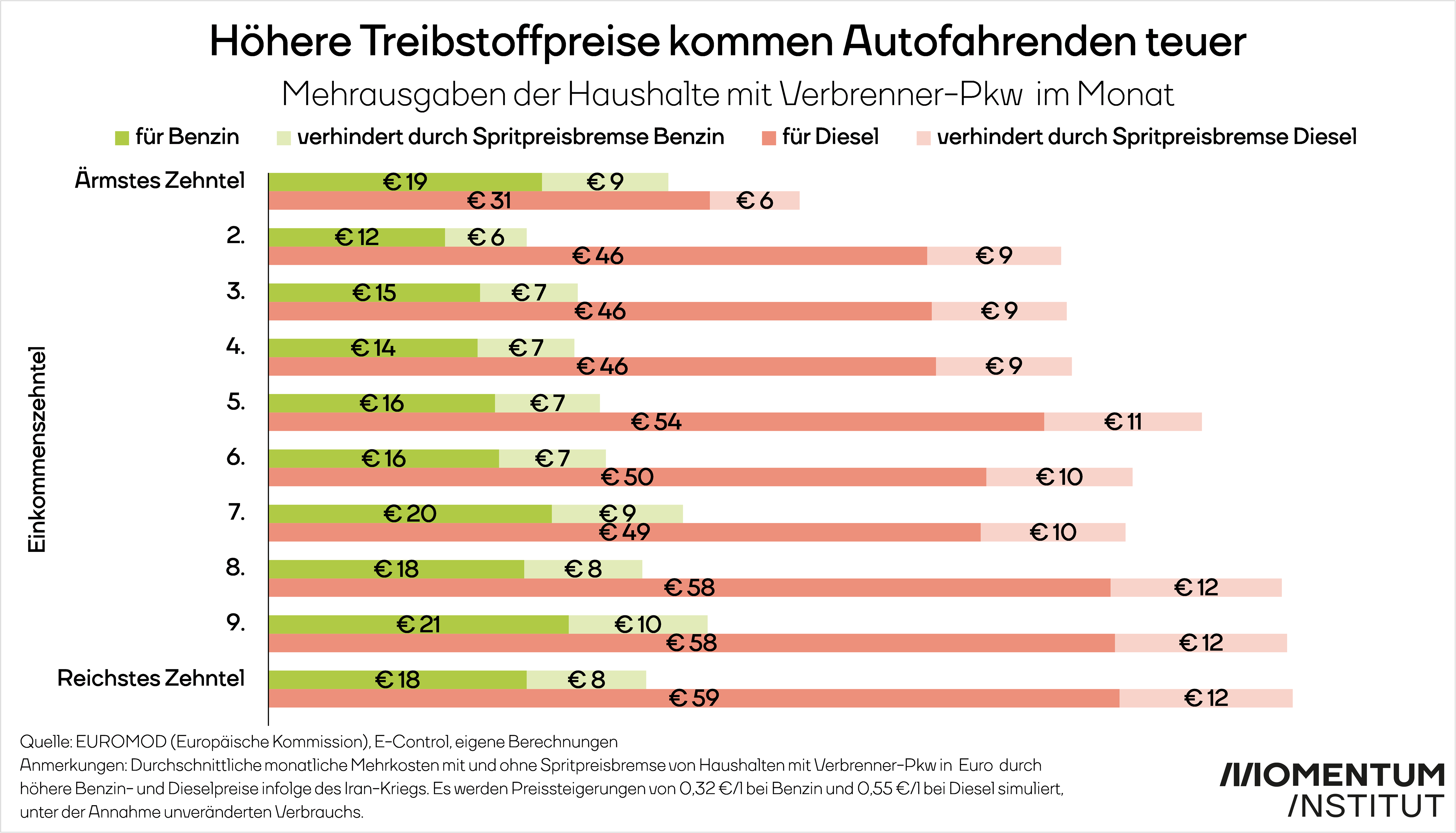 Betroffene Haushalte sind Haushalte, die Ausgaben für Treibstoff (Diesel, Benzin) bei ihren Konsumausgaben angeben. Die Spritpreise sind seit Beginn des Iran-Kriegs seit sieben Wochen erhöht, die Spritpreisbremse gilt aber erst seit drei Wochen. Zur besseren Vergleichbarkeit wurden die Euro-Zahlen auf einen Monat umgerechnet und standardisiert. Für die Ermittlung des Treibstoff-Preisanstiegs werden die Tankstellenpreise sieben Wochen vor und sieben Wochen nach dem Krieg verglichen. Haushalte mit Elektroautos werden nicht berücksichtigt. Der Effekt für besserbezahlte Haushalte wird daher etwas überschätzt. Weil die Daten die stärkere Verbreitung von Elektro- und Hybridautos noch nicht berücksichtigen können, und diese eher von Besserbezahlten gefahren werden, fällt die Ersparnis für einkommensstarke Haushalte in der Realität etwas niedriger aus als in der Simulation.