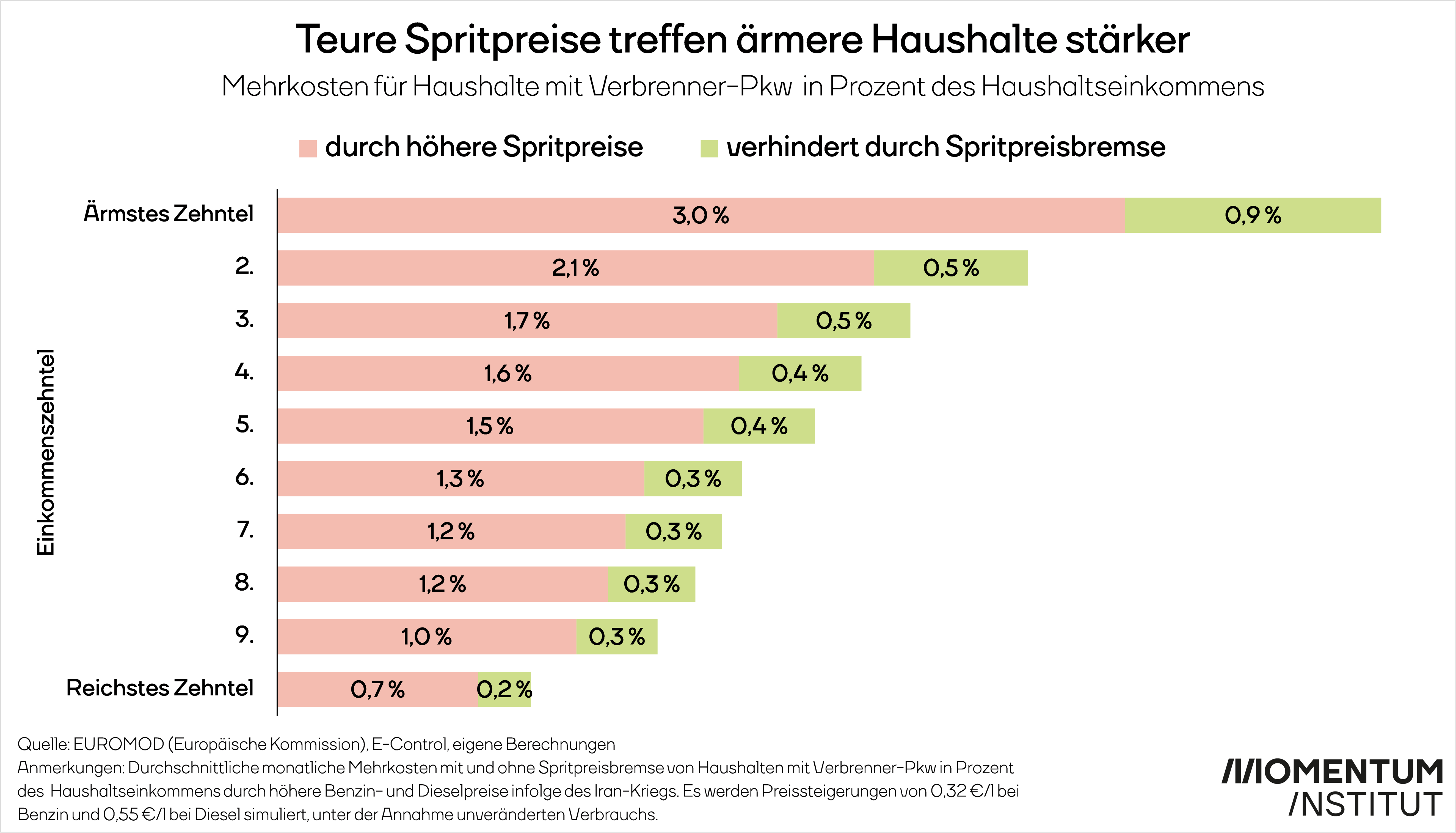 Der Iran-Krieg hat die Spritpreise in die Höhe schnellen lassen. Die gestiegenen Treibstoffpreise bedeuten für betroffene Haushalte mit Verbrenner-Pkw in Österreich im Schnitt Mehrkosten von 1,2 Prozent ihres monatlichen Nettoeinkommens. Die Spritpreisbremse verhindert weitere Mehrkosten in Höhe von 0,3 Prozent des Haushaltseinkommens. Das entspricht einem guten Fünftel der Mehrkosten.