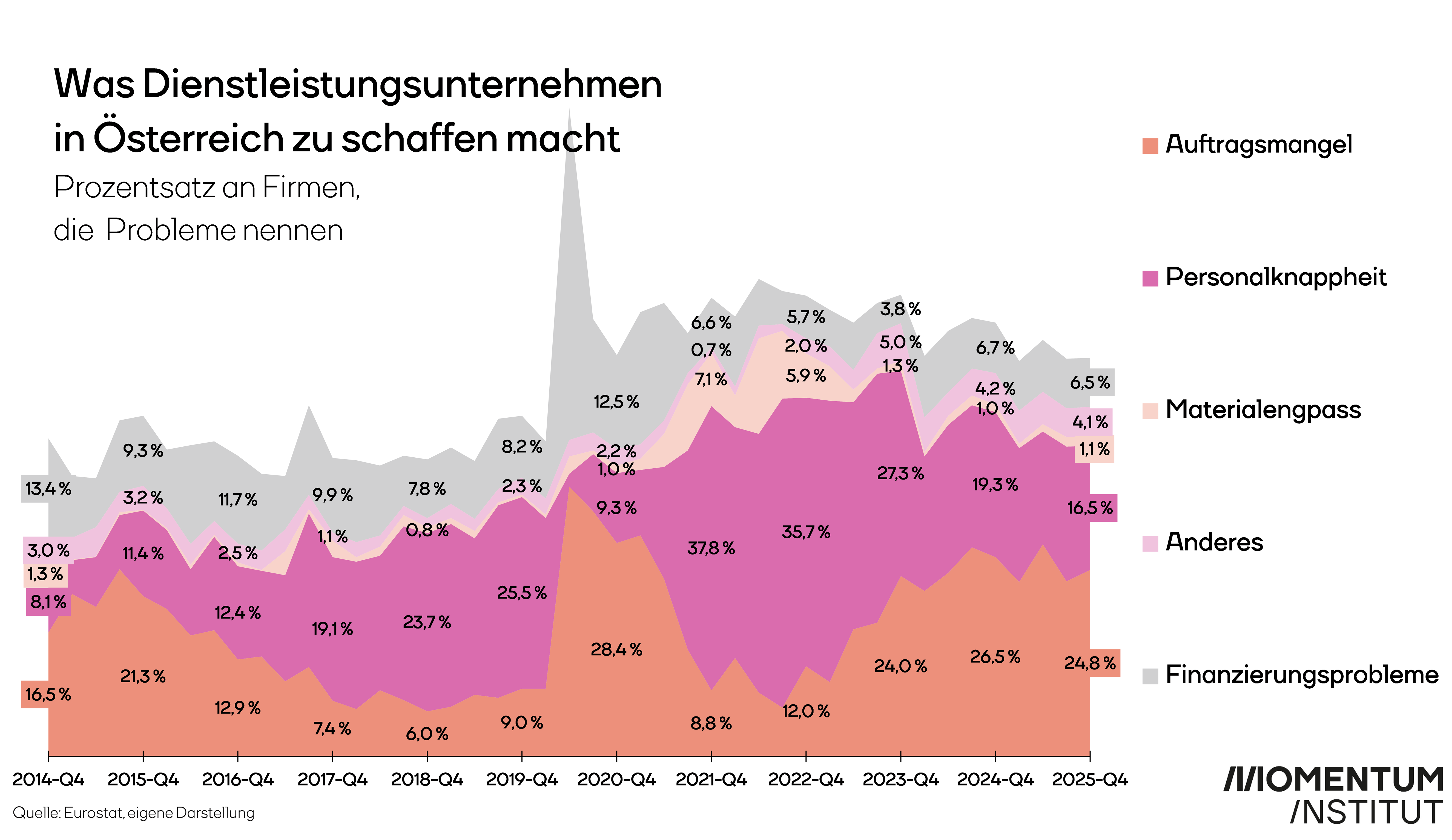 Diese Diagnose untermauert eine Analyse der Dienstleistungsunternehmen in Österreich. Auch hier zeigt sich ein klarer Trend: Der Auftragsmangel gewinnt seit 2022 deutlich an Bedeutung und ist 2025 das mit Abstand häufigste genannte Problem. Ein Viertel der Dienstleistungsbetriebe gibt an, dass fehlende Aufträge ihre Geschäftstätigkeit einschränken. Gleichzeitig geht die zuvor stark diskutierte Personalknappheit spürbar zurück. Finanzierungsprobleme und Materialengpässe bleiben zwar präsent, sind aber deutlich weniger ausschlaggebend als die schwache Nachfrage. Damit wird klar: Die wirtschaftliche Schwäche ist kein reines Industrieproblem. Auch der Dienstleistungssektor gerät zunehmend unter Druck. Der aktuelle Stellenabbau ist daher nicht überraschend, sondern die logische Folge einer anhaltenden Nachfrageschwäche.