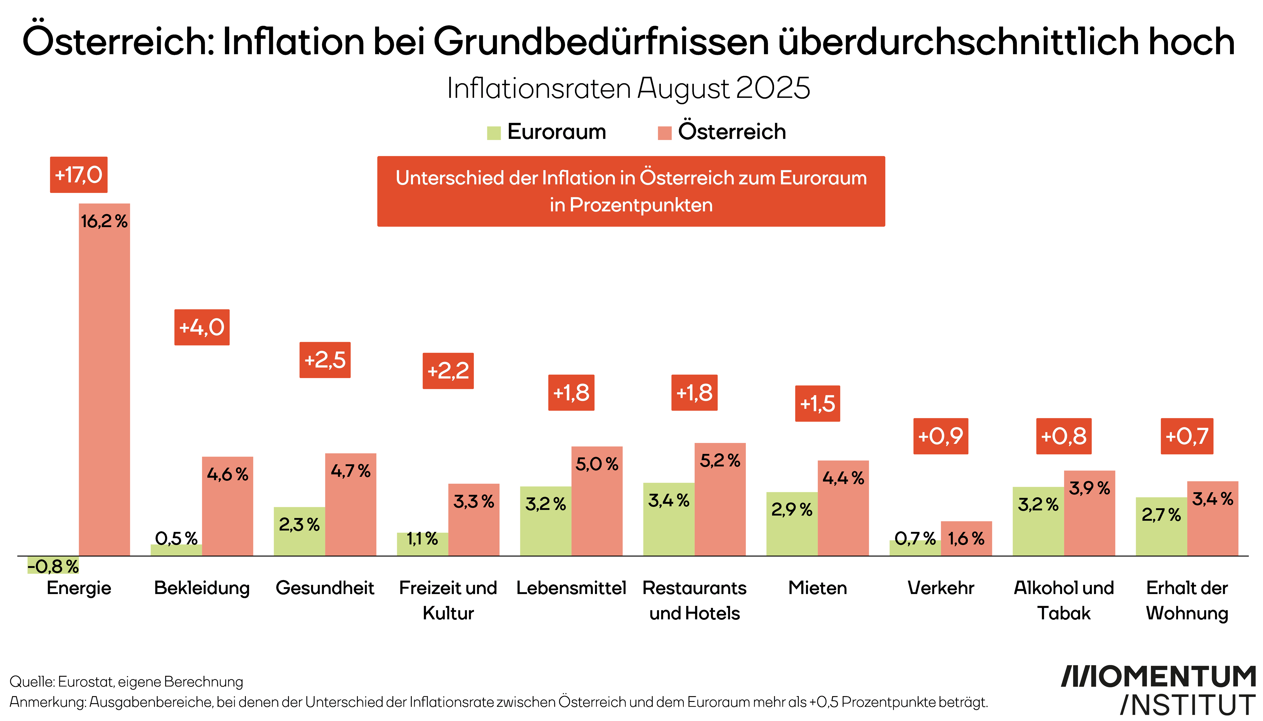 Österreich liegt bei der Teuerung in zentralen Lebensbereichen deutlich über dem Durchschnitt des Euroraums. Während die Gesamtinflation im August im Euroraum 2 Prozent beträgt, liegt sie in Österreich bei 4,1 Prozent – also mehr als doppelt so hoch. Der gravierendste Unterschied ist bei den Strompreisen zu erkennen, deren Teuerung hierzulande um 17 Prozentpunkte über dem Eurozonen-Schnitt liegt.