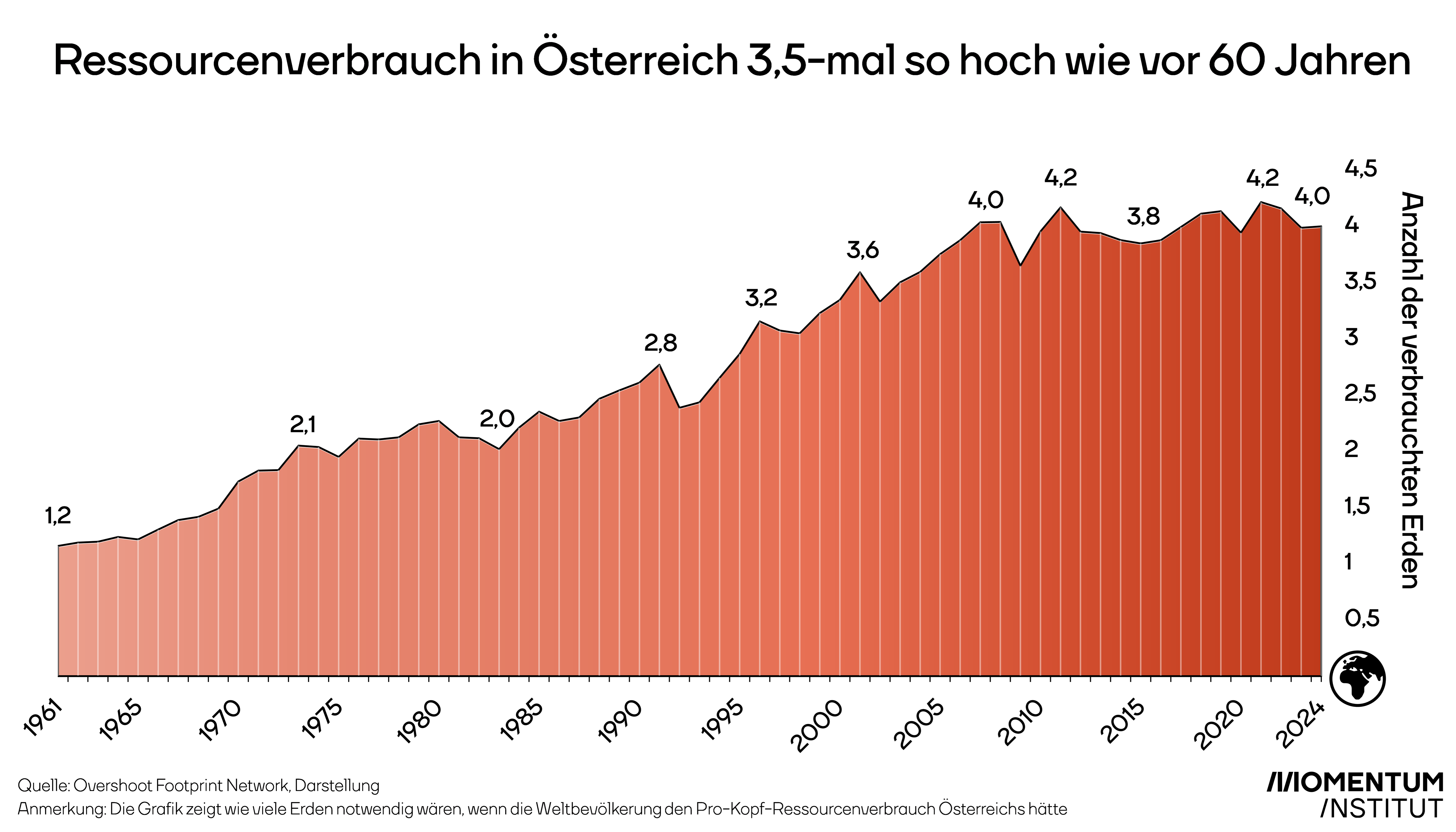 Der österreichische Tag der Erdüberlastung (Earth Overshoot Day) fällt dieses Jahr auf den 2. April. Bereits nach dem ersten Quartal hat Österreich damit so viele Ressourcen verbraucht, wie nachhaltig für das ganze Jahr verfügbar wären. Würde die gesamte Weltbevölkerung auf Österreichs Niveau leben, bräuchten wir vier Planeten. In den 1960er Jahren hätte noch knapp mehr als eine Erde gereicht.