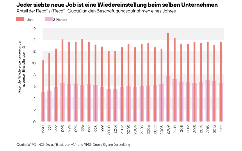Eine teure Praxis manch österreichischer Betriebe ist die „Kündigung auf Zeit“. Sie kündigen bei etwas niedriger Auslastung sofort Mitarbeiter:innen, nur um sie Tage, Wochen oder Monate später wieder zurück zu rufen. So arbeitende Unternehmen hängen der Allgemeinheit ihre Personalkosten um. Sie nutzen gezielt die Existenz einer staatlichen Absicherung während der Arbeitslosigkeit aus. Ohne das Arbeitslosengeld müssten sie ihren Beschäftigten einen höheren Lohn zahlen, damit diese das ganze Jahr über davon leben können. Eines von vier einstellenden Unternehmen setzt auf Kündigungen auf Zeit. Zusammen verursachen sie ein Achtel der gesamten Arbeitslosigkeit. Jeder siebte neue Job ist eine Wiedereinstellung beim selben Unternehmen.